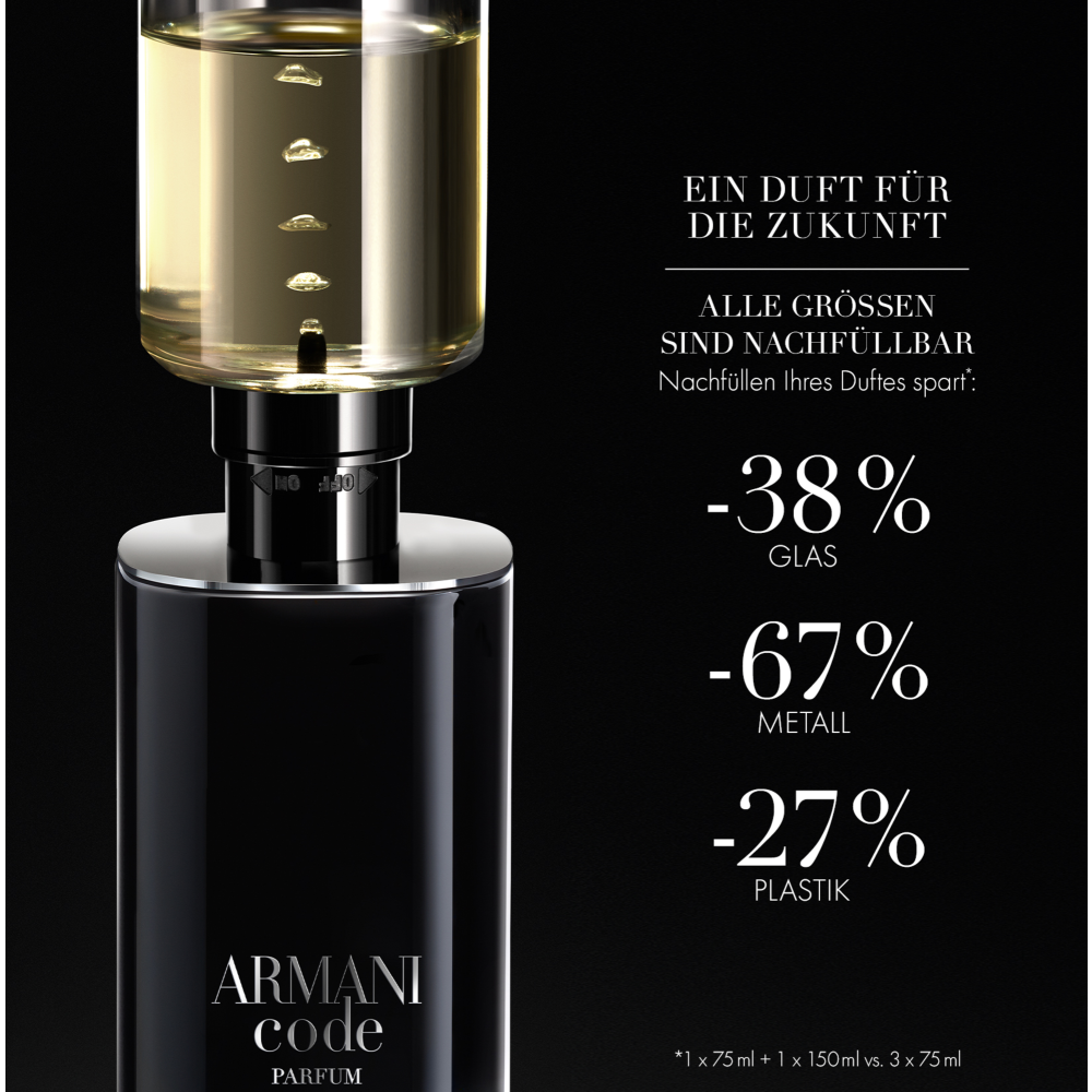 ARMANI CODE PARFUM schlägt ein neues Kapitel auf: Giorgio Armani’s Neuinterpretation von Männlichkeit spricht den Mann von heute an, der mit seiner individuellen Persönlichkeit in Einklang ist. Das Parfum spiegelt mit seinem innovativen Flakon in einem luxuriösen Design, seiner mitreißenden Komposition und seinem bewussten Engagement für Nachhaltigkeit, moderne Männlichkeit wider. Der holzig-aromatische Duft, der mit Bergamotte eingeleitet wird und in der Herznote mit Salbei und Iris-Noten verschmilzt, besticht durch das neue Konzept „REWRITE THE CODE“. Abgerundet wird der Duft in der Basisnote von Zedernholz und Tonkabohnen Absolue, der ikonischen, olfaktorischen Signatur von ARMANI CODE.
