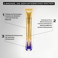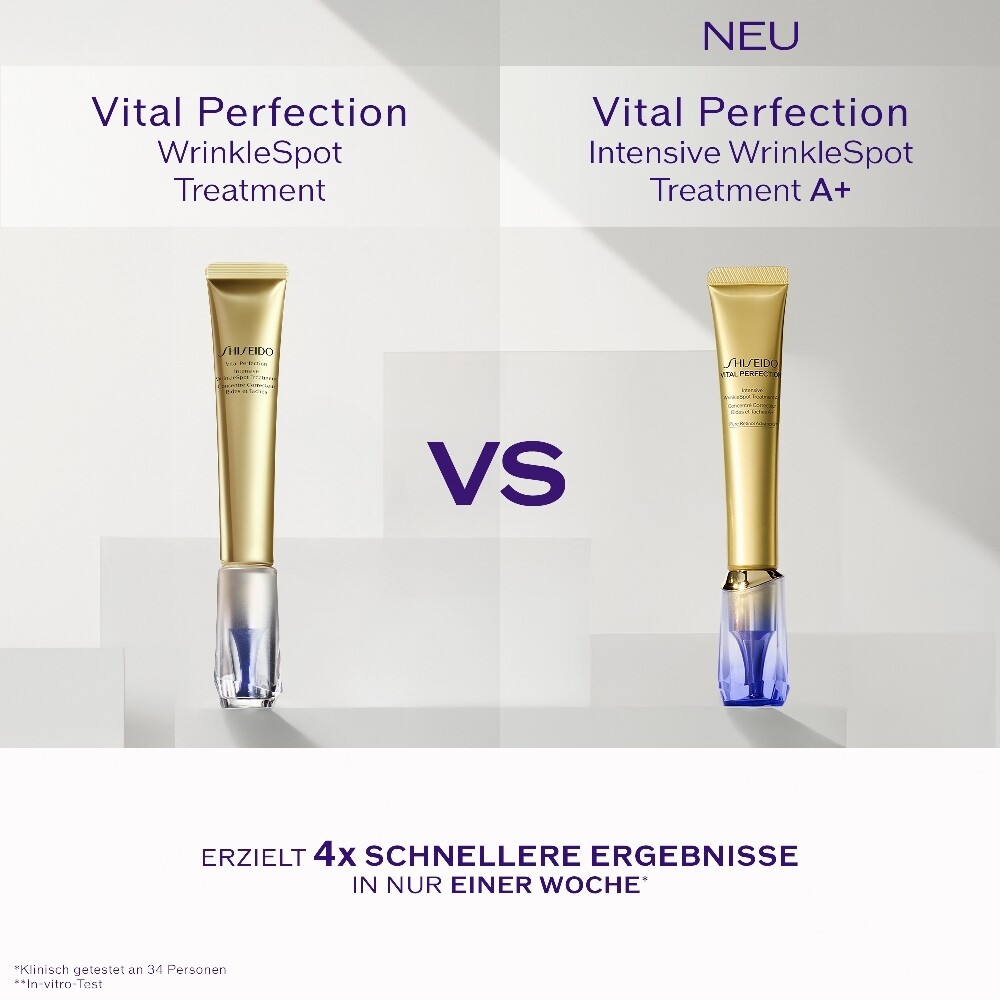 Shiseido präsentiert seine wirksamste gezielte Pflege, entwickelt für die speziellen Bedürfnisse reifer Haut. Dank Pure Retinol Advanced wirkt die innovative Formel effektiv gegen sichtbare Zeichen der Hautalterung: tiefe Falten, lichtbedingte Pigmentflecken und Elastizitätsverlust. Klinisch nachgewiesene Ergebnisse nach nur 7 Tagen*, mit fortlaufender Verbesserung über einen Zeitraum von bis zu 8 Wochen*. Als Teil der Vital Perfection Linie verkörpert das Intensive WrinkleSpot Treatment A+ Shiseidos wissenschaftliche Exzellenz für eine Haut, die sichtbar straffer, gefestigter und strahlender erscheint. *Klinisch getestet an 34 Personen