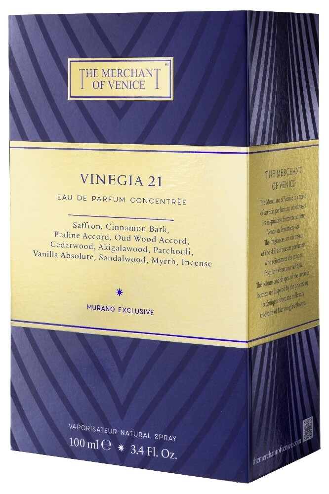 Venedig hat ein großes Ereignis zu feiern: das 1600-jährige Jubiläum der Stadt. Zu diesem Anlass hat THE MERCHANT OF VENICE ein ganz besonderes Geschenk – einen Jubiläums-Duft für sein geliebtes Venedig: VINEGIA 21. Venedig, das früher Vinegia hieß, wurde im Jahr 421 gegründet, als die ersten Siedlungen in der Gegend von Rialto, im Herzen der heutigen Stadt, entstanden. Mit diesem Datum begann ein langer Entwicklungsprozess, der die Stadt im Laufe der Jahrhunderte zu einem von der ganzen Welt bewunderten und anerkannten Juwel werden ließ. Feiern Sie gemeinsam mit THE MERCHANT OF VENICE die einzigartige Stadt Venedig und lassen Sie sich in das Duftspektrum der alten Handelsstadt entführen. VINEGIA 21 ist inspiriert von einem zauberhaften Traum, in dem die Reichtümer der alten Hafenstadt entdeckt werden: Neben prächtigen Brokatstoffen und Samt, findet man würziges Zimtpulver, goldene Safranfäden und Pralinen. Kostbare Hölzer erinnern an die Düfte eines Waldes bei Sonnenuntergang und Oud-Noten lassen unvergessliche orientalische Nächte wieder aufleben. Cremige Vanille und betörendes Sandelholz verbinden sich zuletzt mit den rauchigen Noten von Myrrhe und Weihrauch.